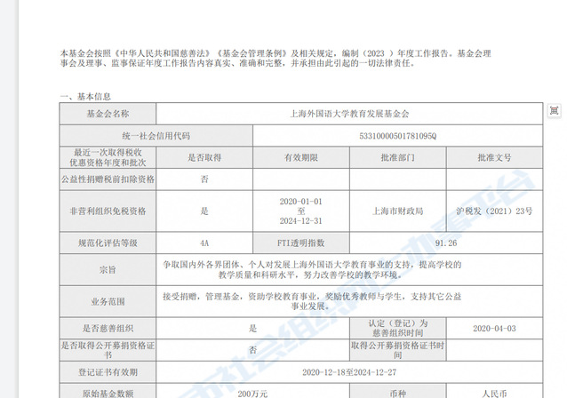 2023年,上海外国语大学教育发展基金会首次参加中基透明指数FTI指标观测,结果为91.26分。未来基金会将根据信息公开要求进一步完善信息公开,增加透明度。